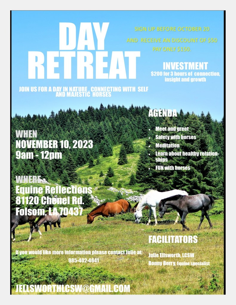 I Offer equine retreats in the beautiful Folsom, LA. You will spend time connecting to self and horses. This session are designed to help build meaningful connections and relationships in your life.