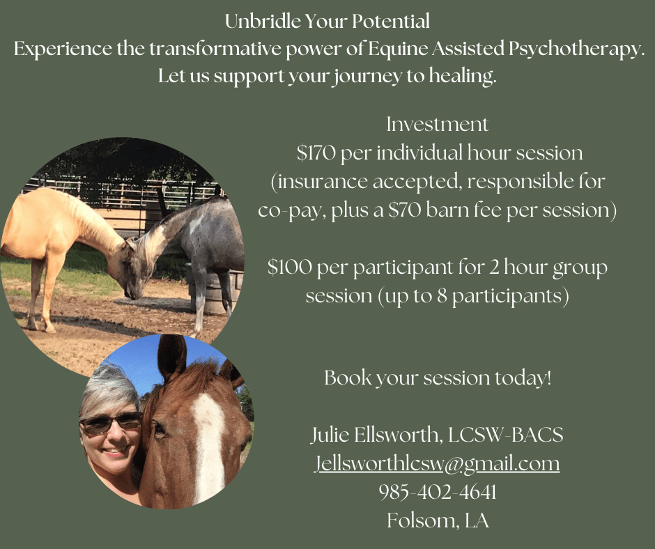 Equine-assisted psychotherapy (EAP), is an innovative, experiential approach that actively involves horses in therapeutic sessions. A powerful, evidence-based modality, focuses on healing through the relationship of the horse and in connection with the therapist.